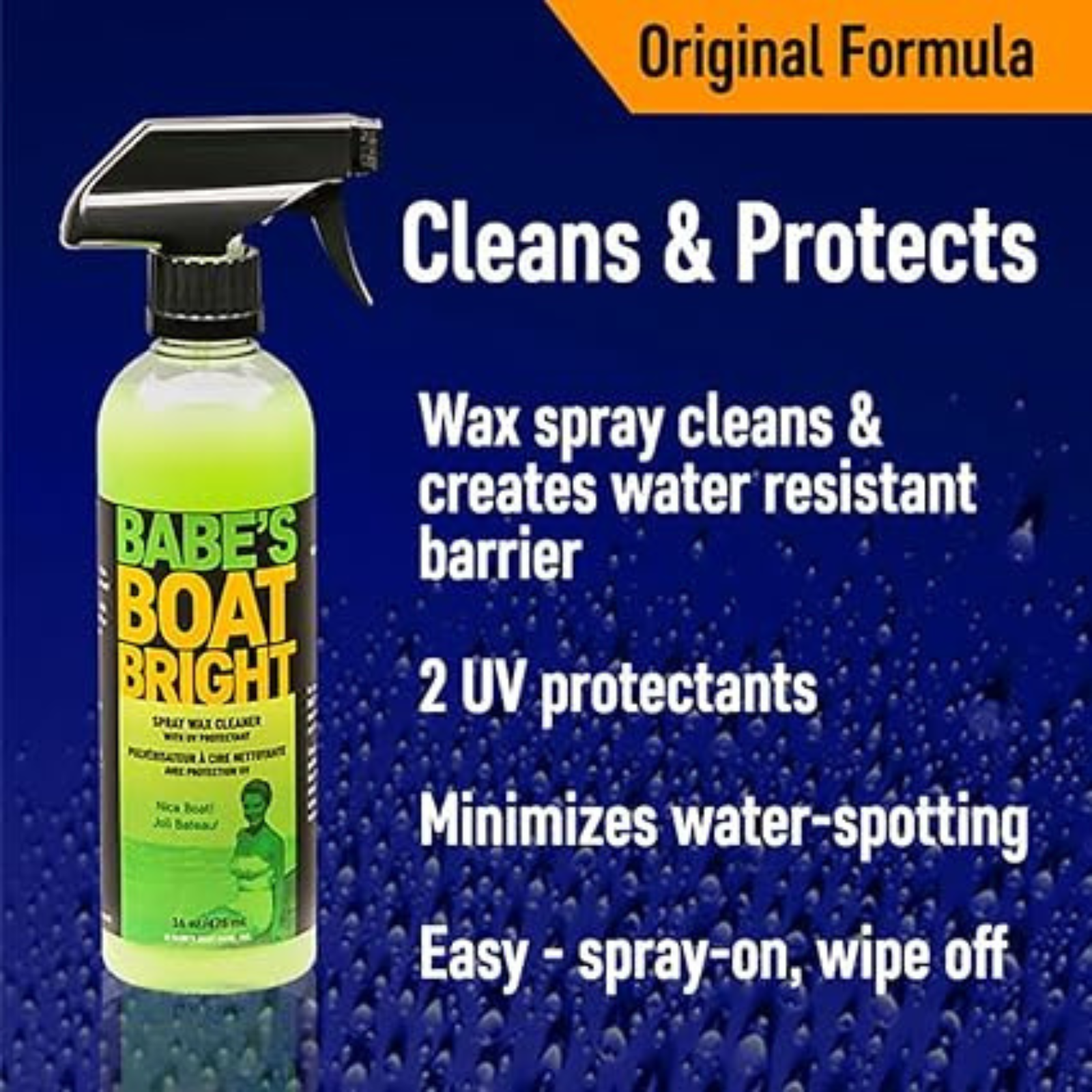 BABE’S Boat Bright is formulated to create a water repellant barrier on surfaces causing the water to roll right off. This barrier reduces water spotting by keeping minerals from sitting on the surface. The repellant also adds a mar-resistant coating that minimizes scratches. And, the UV protectant helps to protect your boat from oxidation and fading.